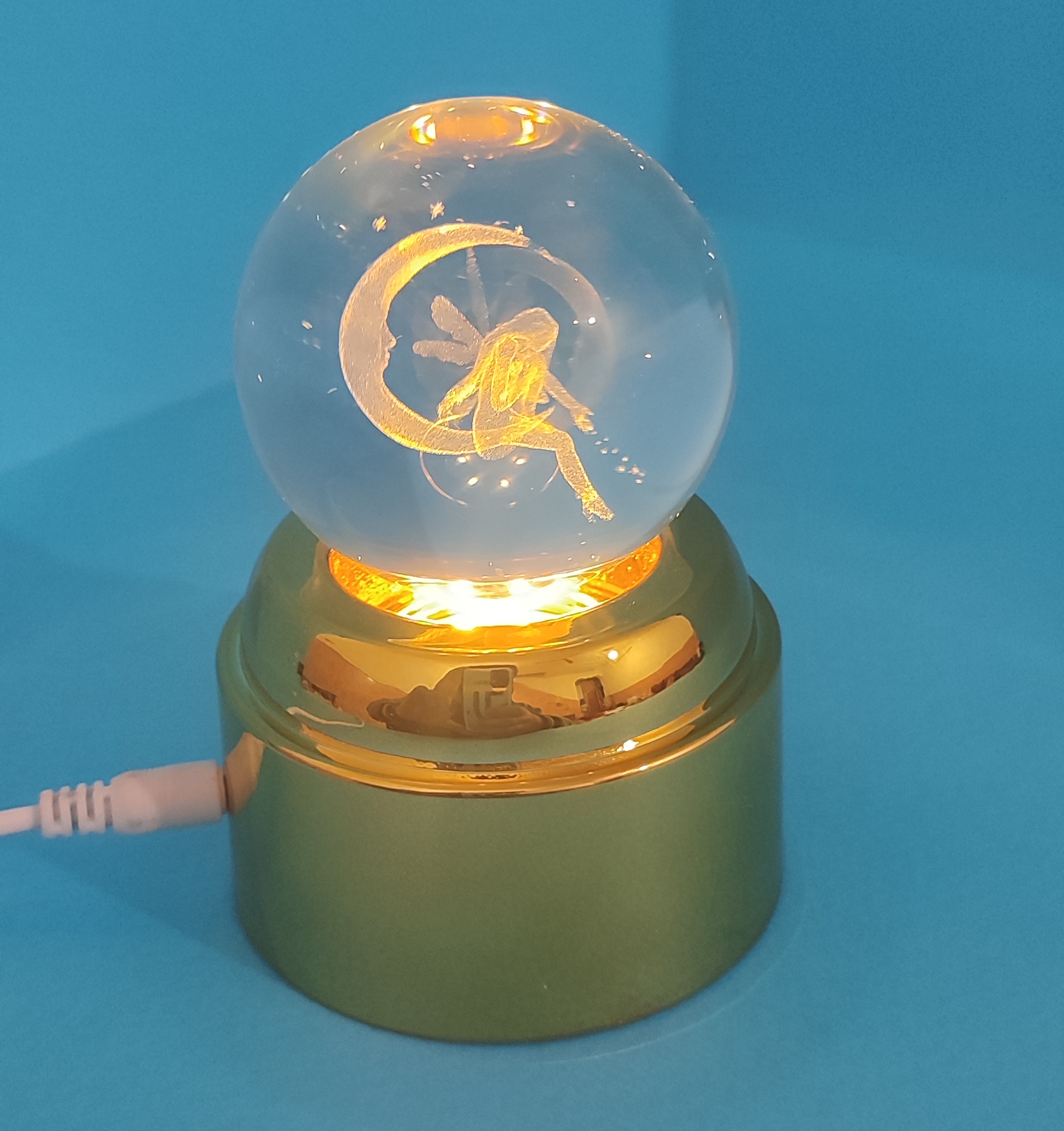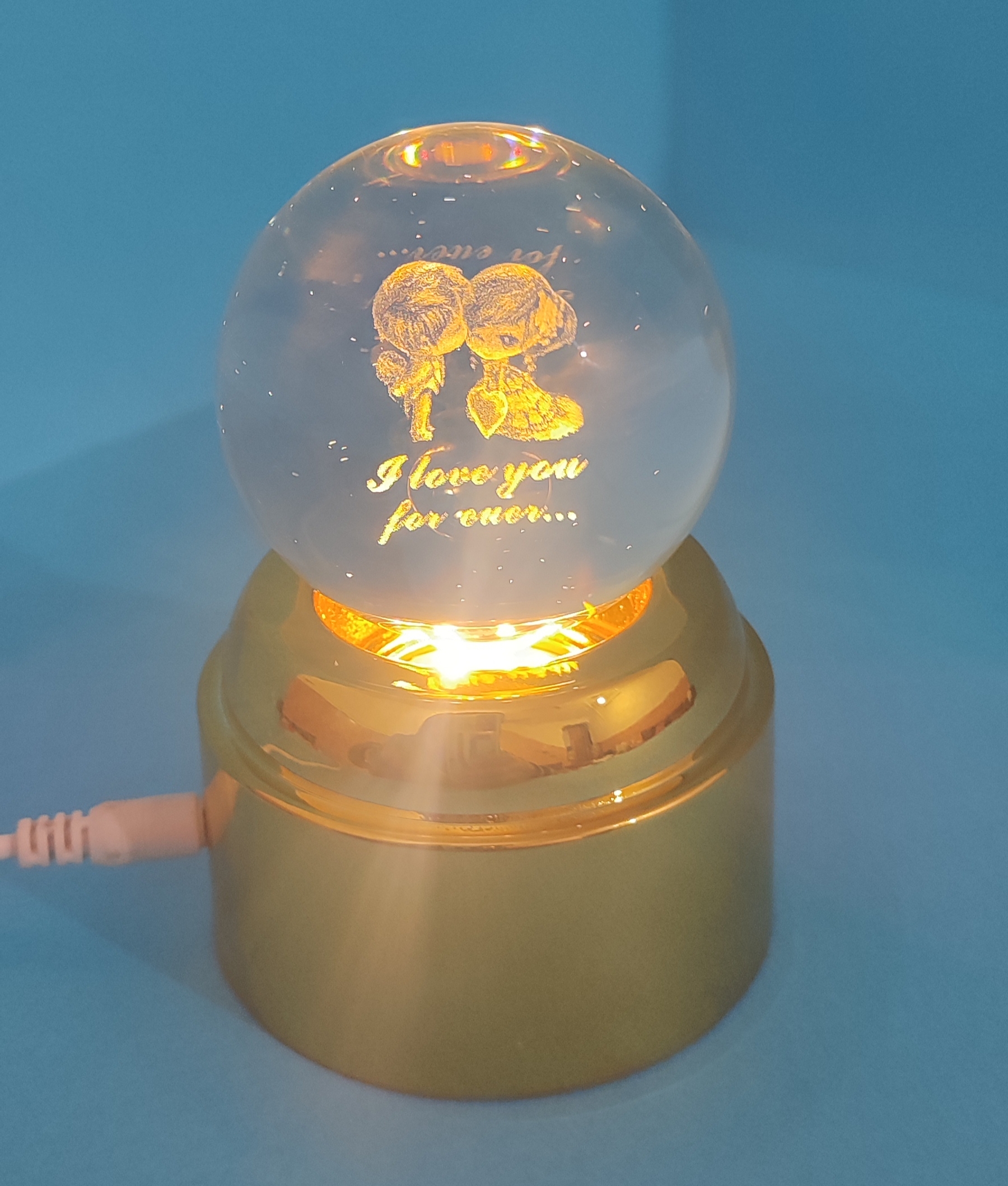 چراغ خواب گوی کریستالی سایز شش دارای پایه طلایی زیبا ، دارای موتور چرخشی دارای نور ال ای دی دارای کلید قطع و وصل در طرح های متنوع و فانتزی کم مصرف منبع تغذیه پنج ولت دی سی