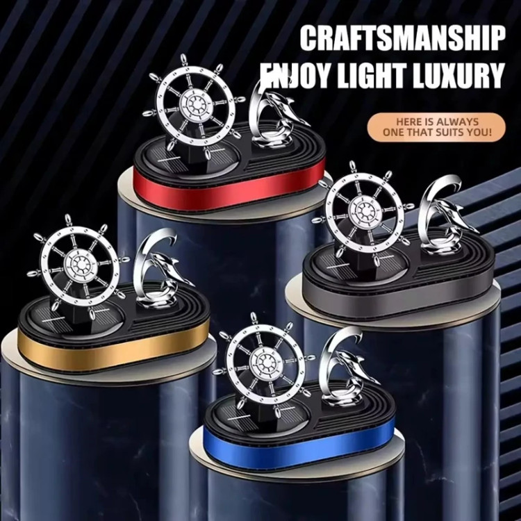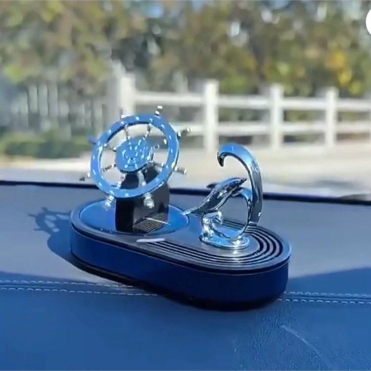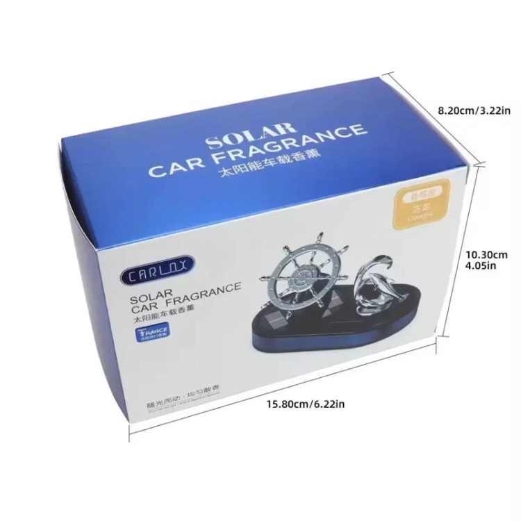 خوشبو کننده خورشیدی خودرو با قرار گرفتن روی داشبورد با تابش نور آفتاب شروع به چرخش می کند و نیاز به هیچ منبع تامین انرژی دیگری ندارد. لوازم همراه : برچسب اتصال به داشبورد طرز کار: ته محصول را باز کنید و پد همراه آن را در جای مخصوص آن قرار دهید و چند قطره اسانس روی آن بچکانید و درب آن را ببندید.