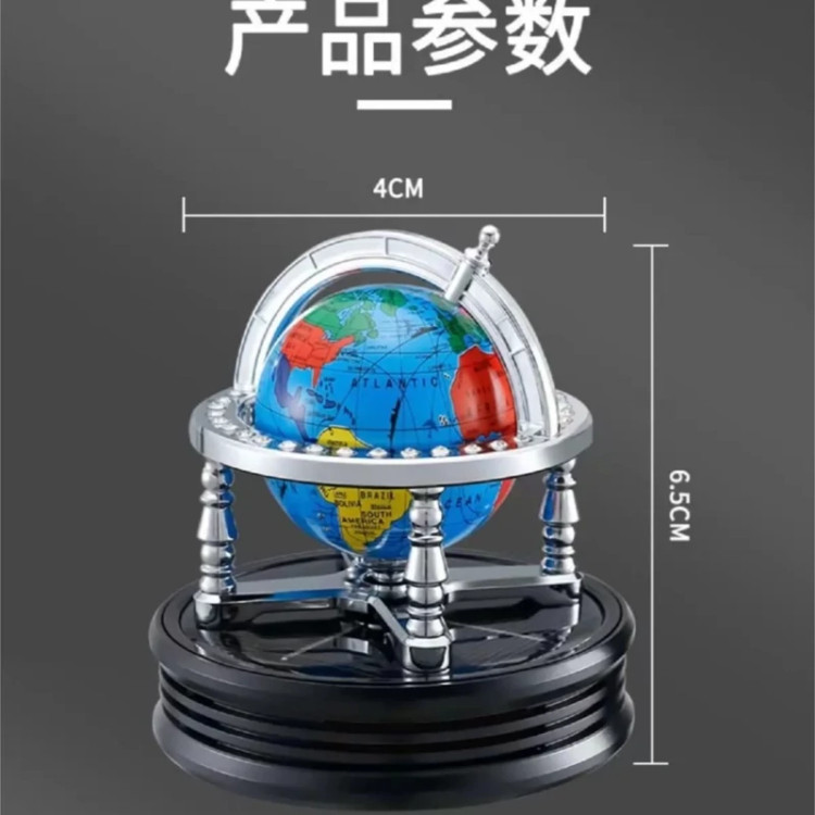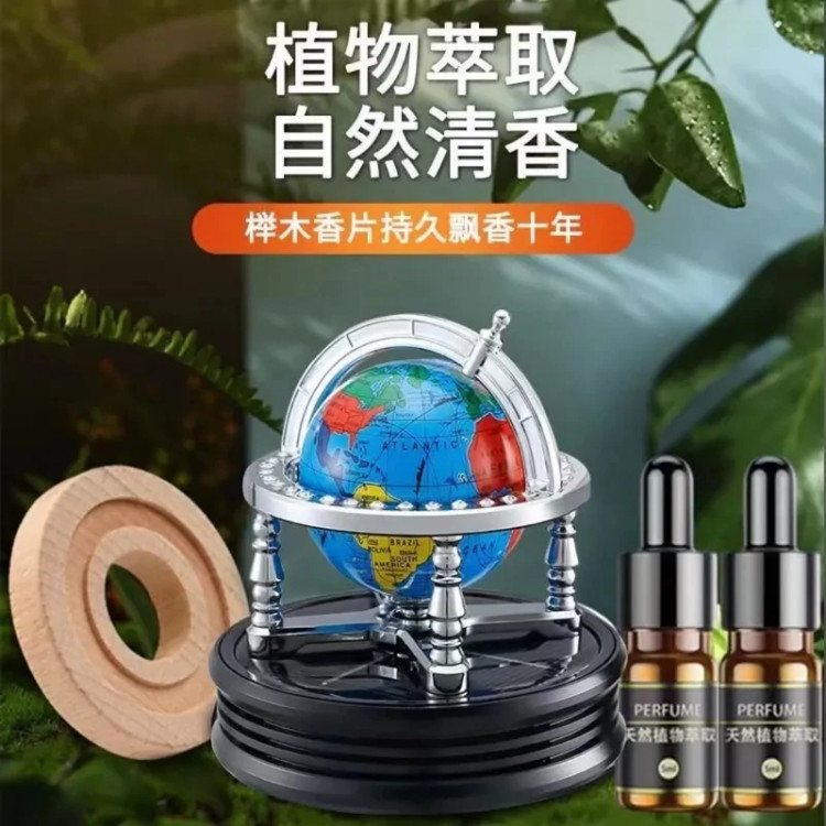 این محصول یک خوشبوکننده خودرو است که در قسمت ته محصول یک برچسب اتصال به داشبورد قرار دارد با تابش نور خورشید به پنل خورشیدی کره زمین شروع به چرخش می کند بدون نیاز به باطری برای استفاده از خوشبوکننده کف محصول رو بچرخانید تا باز شود ، سپس چند قطره خوشبوکننده روی چوب پنبه داخل آن بریزید و درب آن را ببندید همراه محصول یک بطری قطره چکان دار عرضه میشود.